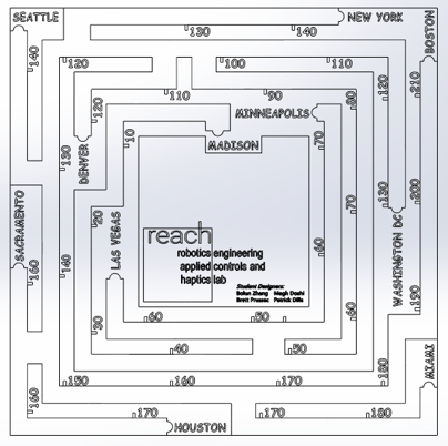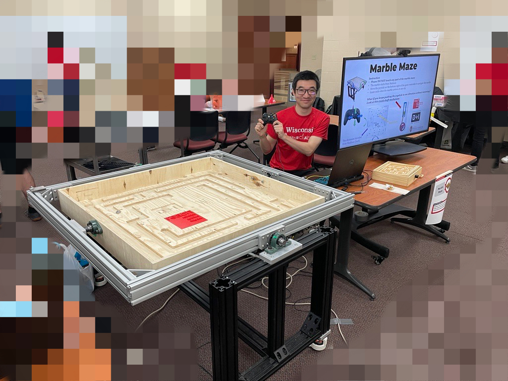 The giant marble maze is driven by electric motors and being controlled by a game controller. The game is that a marble starts from Madison and participants can operate teh maze to arrive a city of destination. Please see this video (0:20 to 0:35). It was showcased at UW-Madison Engineering EXPO 2023. It was recognized as the most popular demo of the event!